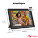 De fotolijst is zowel staand als liggend in te stellen. De foto’s draaien automatisch mee. Bij de lijst is een standaard meegeleverd. Ook heeft de fotolijst aan de achterkant 2 bevestigingspunten, waaraan de fotolijst is op te hangen.